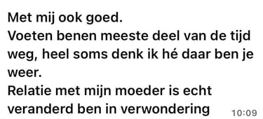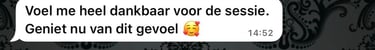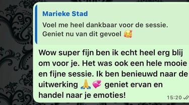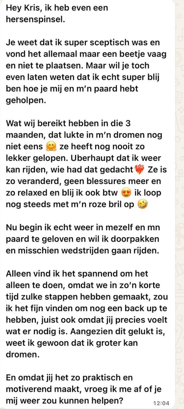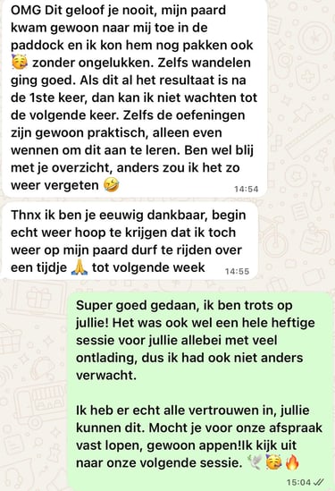 De sessie zelf heb ik als superfijn ervaren. Ik merkte direct dat er iets verschoof. Het voelt alsof ik dichter bij mijn paard sta en dat er van beide kanten meer begrip is ontstaan. De grootste verandering is de rust die ik nu bij haar voel en het vertrouwen dat tussen ons gegroeid is.