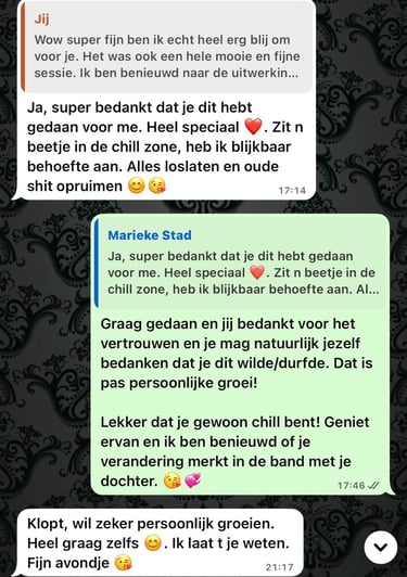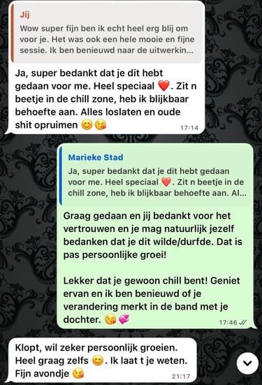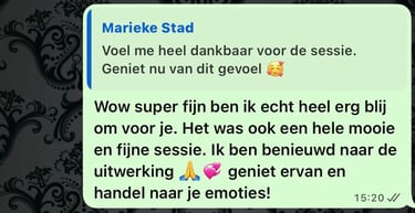 In een andere sessie gingen we aan de slag met mijn twijfel en het gevoel dat ik steeds vastliep. Wat eruit kwam was echt spot on. Het bleek dat het probleem een paar generaties terug lag, iets wat niet was opgelost en wat ik nu nog steeds meedroeg. Zonder dat Kristel iets wist over mijn achtergrond klopte alles wat ze zei. Dat vond ik zo bijzonder.