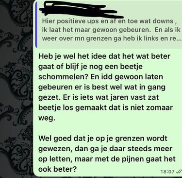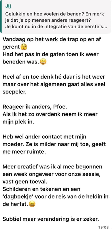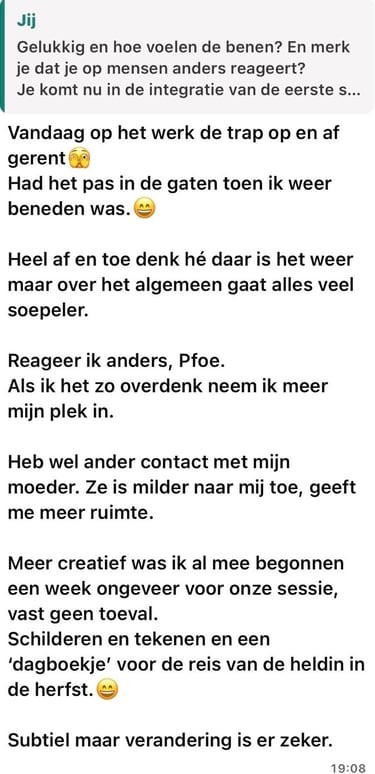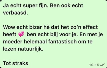 Toen kwam Kristel op mijn pad. Ze maakt wat ze doet heel toegankelijk en begrijpelijk. Ze is gewoon een heel leuk persoon om mee te werken en tegelijkertijd ook echt betrokken in het proces. Door haar nuchtere manier van doen voelt het totaal niet zweverig, maar juist heel logisch. En toch laat ze elke keer weer zien wat ze allemaal kan, waardoor ik echt met verbazing sta te kijken.