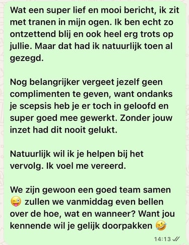 Ik ben ontzettend blij met haar hulp en met wat ze allemaal kan oplossen. Ik denk dat eigenlijk iedereen hier baat bij zou hebben, zelfs als je er niet helemaal voor openstaat. Ik zou het gewoon proberen als ik jou was. Het zal je verbazen. Kristel is totaal niet zweverig en dat maakt het juist zo fijn. Ze is nuchter, dit is gewoon haar gave én haar missie. En het grappige is dat ze soms zelf ook nog verbaasd is over wat ze allemaal teweegbrengt met haar sessies.